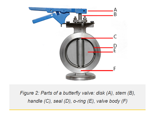 Toimintaperiaate Läppäventtiileillä on suhteellisen yksinkertainen rakenne. Kuvassa 2 on esitetty läppäventtiilin pääkomponentit, jotka ovat runko, tiiviste, kiekko ja varsi. Läppäventtiilin kiekko (kuva 2 merkitty E) on kohdistettu liitetyn putkiston keskustaan ja kara (kuva 2 merkitty B) liitetään toimilaitteeseen tai kahvaan venttiilin ulkopuolella. Suljetussa asennossa kiekko on kohtisuorassa virtaukseen nähden, kuten kuvassa 2 näkyy, ja tiivistää venttiilin istukkaa vasten (kuva 2 merkitty D). Karan tiivisteessä oleva O-rengas (kuva 2 merkitty C) estää vuodot varren varrella. Kun toimilaite tai kahva kääntää läppäventtiilin karaa 90°, myös kiekko pyörii 90° ollakseen yhdensuuntainen virtauksen kanssa. Osittainen pyöritys mahdollistaa virtauksen kuristamisen tai verrannollisen.
