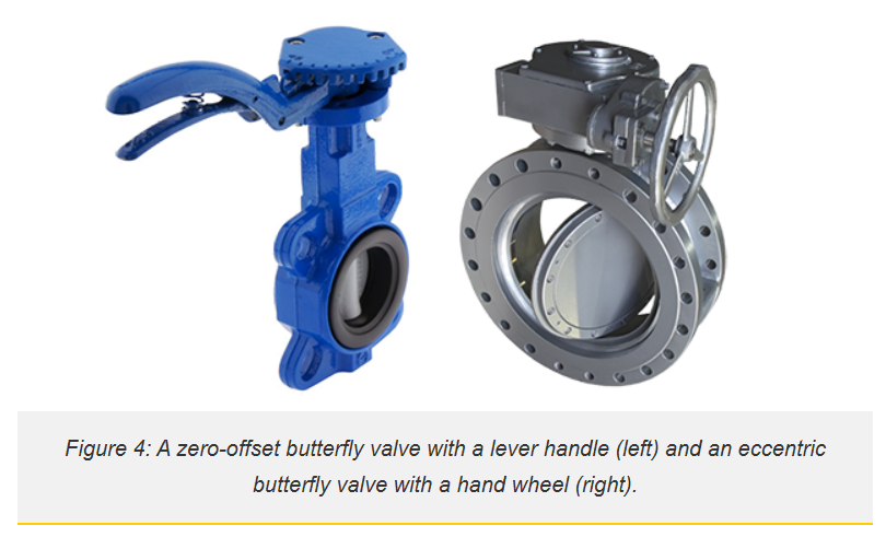 Läppäventtiilityypit Läppäventtiilejä on eri malleja, joista jokainen palvelee tiettyjä sovelluksia ja painealueita. Läppäventtiilit voidaan luokitella niiden kiekkosulkurakenteen, liitäntärakenteen ja käyttötavan perusteella. Levyn sulkemissuunnittelu Läppäventtiilit voivat olla samankeskisiä tai epäkeskisiä riippuen varren sijainnista suhteessa kiekon keskilinjaan ja venttiilin istukan pintakulmaan.Konsentrinen Läppäventtiilin tai samankeskisen läppäventtiilin perusrakenne on mutkakeskeinen. Varsi kulkee levyn keskilinjan läpi ja istukka on venttiilirungon sisähalkaisijan kehä (kuva 4 vasemmalla). Tämä nolla-offset-venttiilirakenne tunnetaan joustavana istukkana, koska tehokas tiivistys perustuu kumisen istukan joustavuuteen. Suljettaessa levy koskettaa ensin istuinta noin 85° kulmassa 90° käännöksen aikana. Samankeskiset läppäventtiilit sopivat matalapainealueille.
